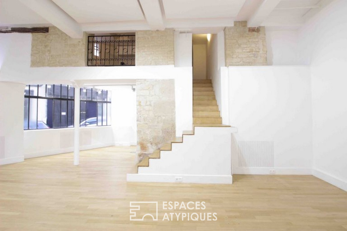 There is a furnished kitchen upstairs. This raw and industrial space has natural light thanks to its huge bay windows.