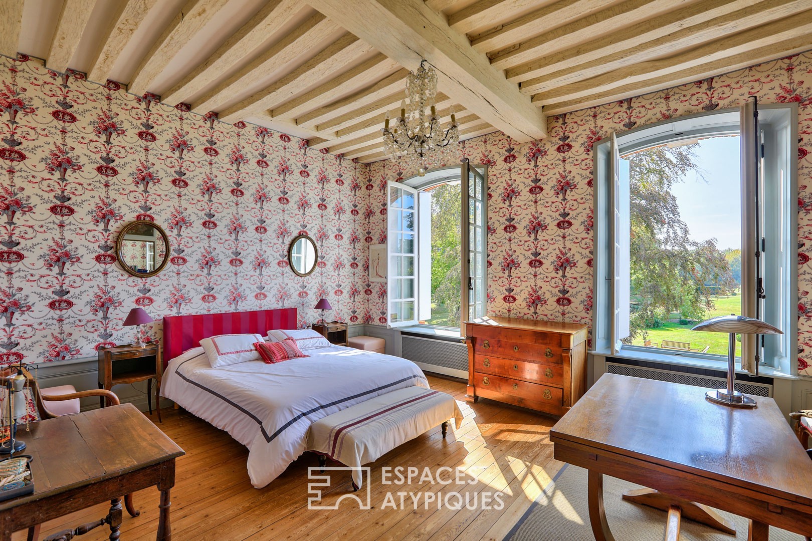 L’intérieur de la demeure, quant à lui, offre des salons avec boiseries et sol en ancienne pierre, une salle à manger d’époque, une cuisine et enfin plusieurs chambres.